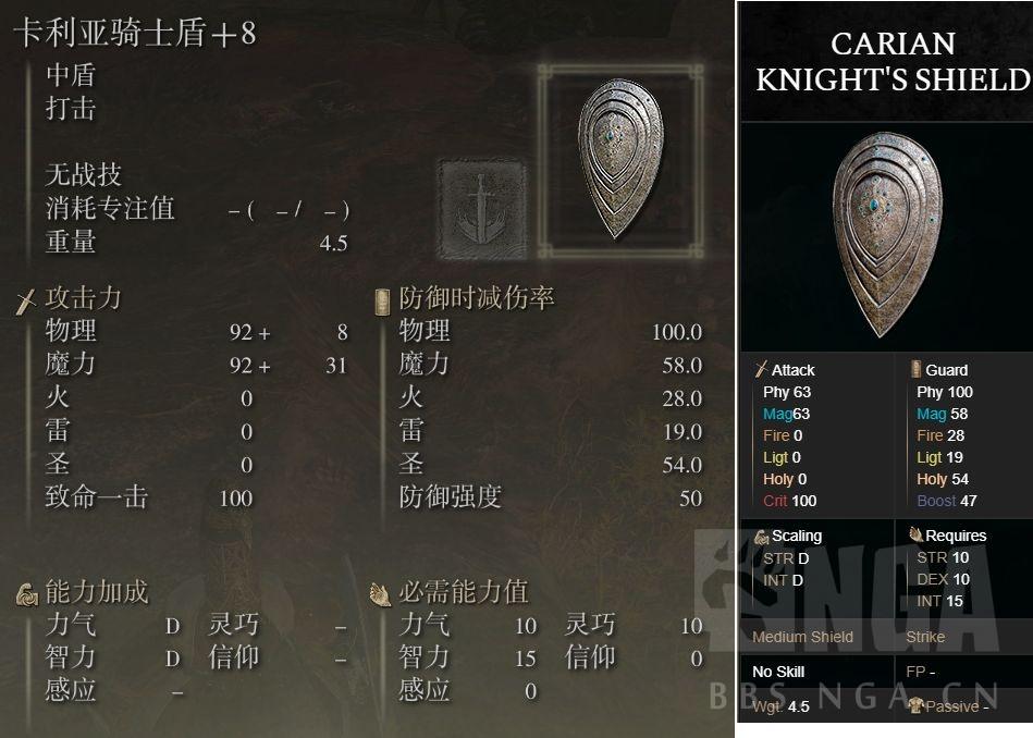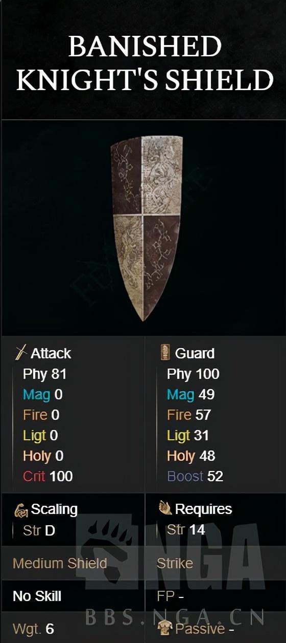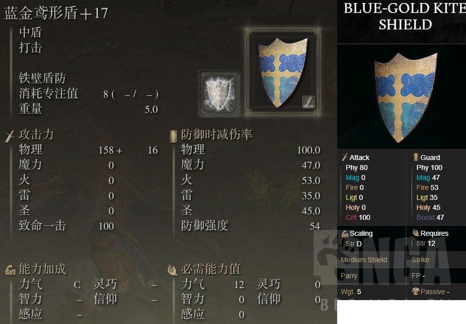 已知黄铜盾+25有69防强,如果不同中盾强化加的防强一样的话,失乡骑士盾+25可以有65防强,蓝金盾+25可以有60防强。如果是用拉达冈腐烂烙印带的名刀月影的占星,会有13力量。这时投资一点力量就能拿起失乡骑士盾。