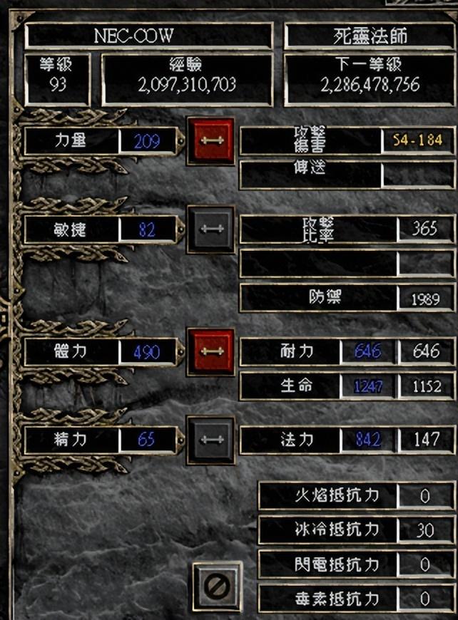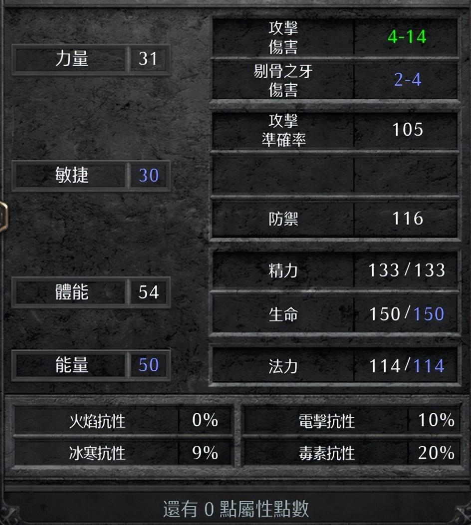 首先,我们可以看到,暗黑破坏神2的人物角色共分为四大基础属性,分别是力量(强壮),敏捷、体力(活力)、精力。其中敏捷和力量都会提升人物角色在使用武器时的白值伤害。敏捷额外还能够附加格挡几率,基础防御跟基础命中。体力值则会直接关系到人物角色的生命值上限跟耐力值,后者就是人物在场景跑动时所消耗的黄色条状属性。最后一项基础属性,精力值,则会影响到人物角色的法力值上限跟法力回复速度。