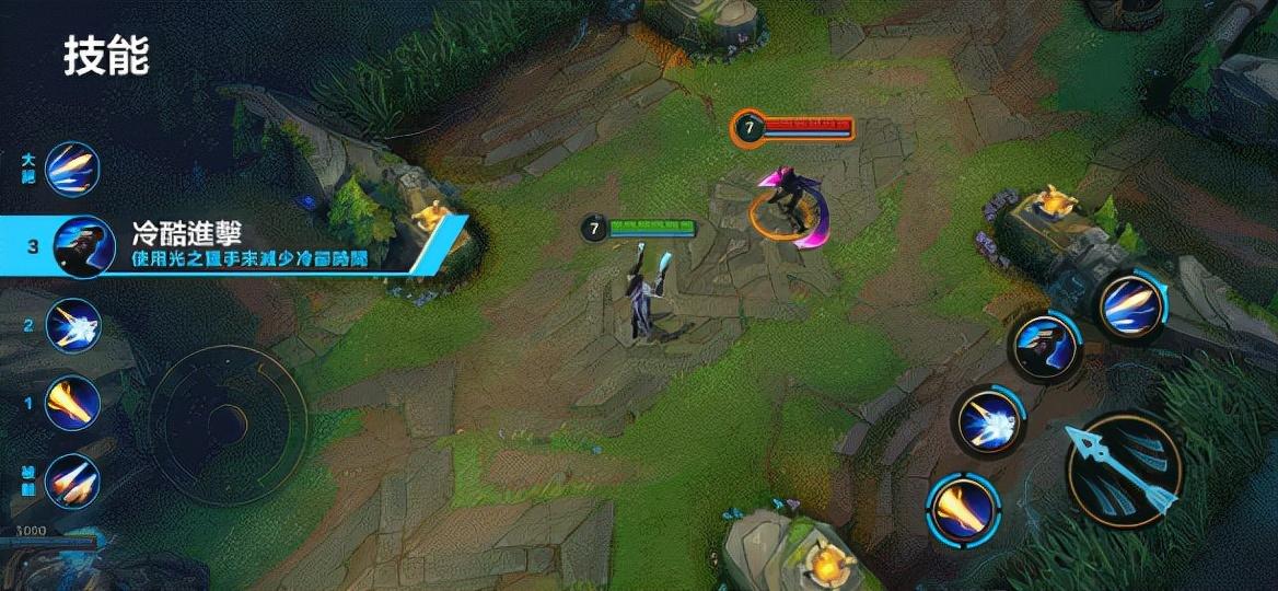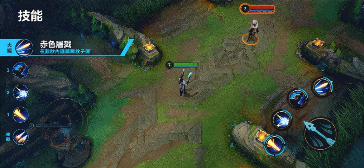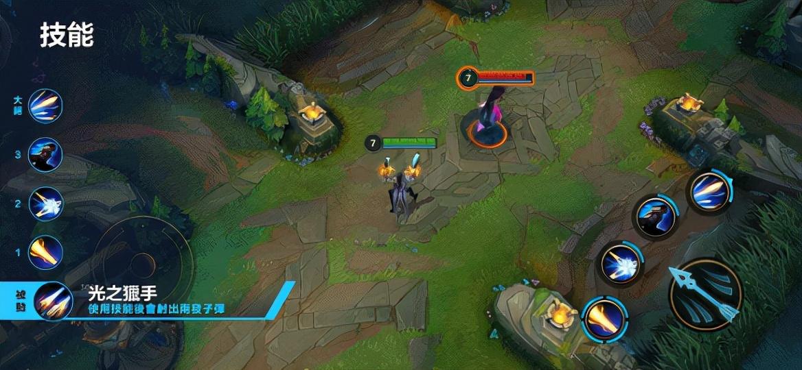 可以看到,Q技能的释放距离貌似是比端游长了不少,但有可能是手游地图比列的问题。演示中,卢锡安并不是在极限距离释放的透体圣光,也就是说这个距离几乎可以拉长到与河道齐平。