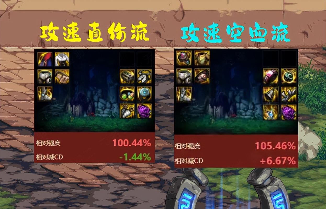 4、攻速空血流,以攻速鞋、空血手镯、恩特上衣为核心,伤害9.7分,冷却8.8分,这套搭配的伤害已经接近了天花板,而且因为走的是空血流,自身坦度也非常高,预计会成为国服主流搭配之一。