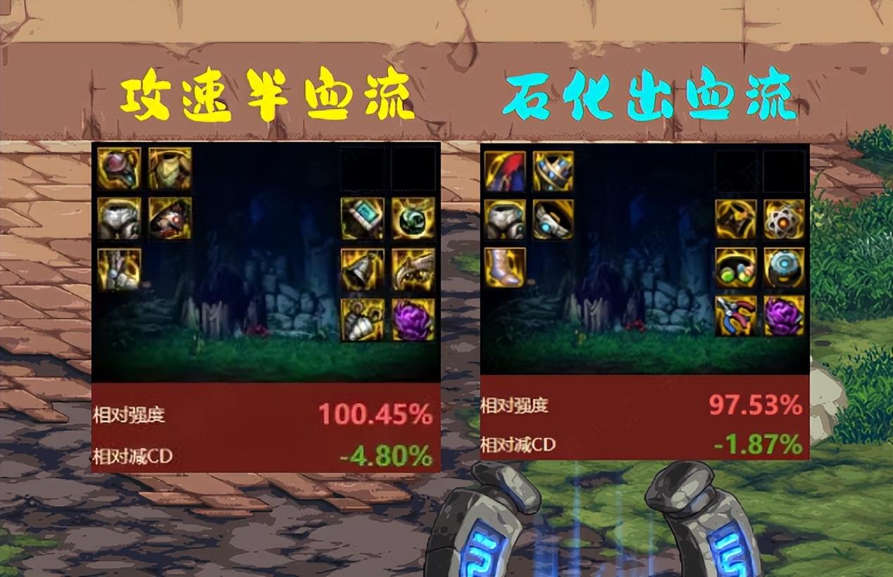 6、石化出血流,以石化鞋和蓝灵石为核心,伤害9.2分,冷却9.1分,速度远低于攻速流派,但好处在于,终于可以不用堆叠攻速了。