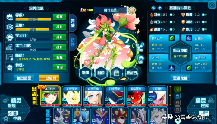 对比布布花的花里胡哨外加还是个物理型精灵,魔花仙子就不是了。而且综合技能组上,魔花仙子都是要优于布布花,其中当年最逆天的玩法就是【催眠粉】+【毒粉】+【麻痹粉】+【能量吸取】,换掉能量吸取上【香甜气息】,30级即可单挑魔狮迪露。