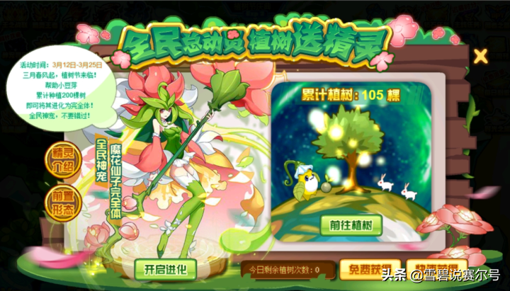 今年3月份植树节再度回归,累计种植200颗树,即可将前置形态魔灵仙女进化为新精灵魔花仙灵,并获得其第五技能、专属特性、专属刻印。需先将前置形态放入出战背包设成首发进化为新精灵,消耗旧精灵。