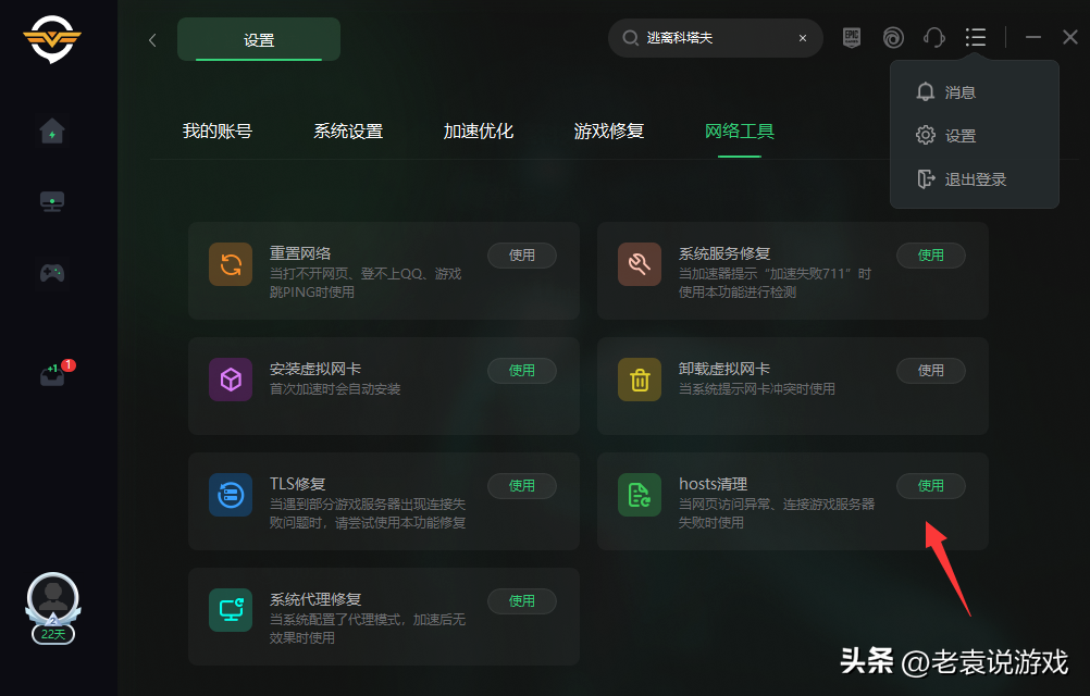 关于hosts文件被污染的问题,每天都有玩家反映,这也是正常现象。玩家只需打开奇游右上角设置,选择网络工具,点击使用hosts清理功能。这样就可以修复hosts,恢复网络了。玩家等修复后,再重新登录逃离科塔夫即可。