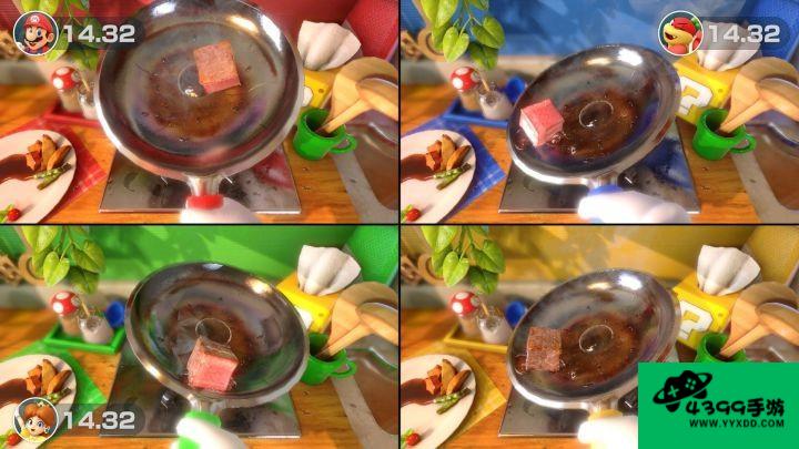 画风可爱的小游戏炸牛排在体感上运用得恰到好处。四名玩家用手柄模拟平底锅,将锅中的牛肉六面煎熟,才算赢得游戏。听起来很简单,但要保证牛肉的每一面都是油炸的,不仅要时刻关注牛肉是否油炸糊状,还要掌握颠勺的小技巧,这样从四名玩家中脱颖而出就没那么容易了。