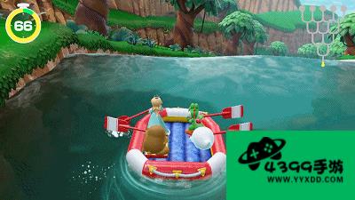 三:派对游戏进行时 超级马里奥派对为派对带来了丰富的游戏内容。在类似于大富翁棋盘的马里奥派对模式中,最多支持4人同时玩游戏,团队包括1v3与2v两种;在小游戏模式中,玩家可以直接体验80种小游戏带来的快乐。可以说,只要在聚会上牺牲超级马里奥派对,就意味着聚会的高潮即将到来! 踩点狂魔!节拍模式 节拍模式作为游戏的四种模式之一,可以让玩家尽快掌握游戏的要点,热身派对气氛。节拍模式提供了几款与节奏相关的小游戏:地鼠、品牌、金币和赛马……玩家唯一要做的就是根据每个游戏的音乐节奏反馈。第一次开始Switch主机玩家可以通过这种模式,熟悉手柄的体感和振动。当然,轻松愉快的小游戏和配乐,以及每场比赛结束后的排名,都能慢慢调动玩家的兴趣。 如果玩家接触过节奏天国这样的音乐游戏,那么这种模式下的体验就会成倍增加。随着每一款游戏滴滴滴的音乐鼓点,我不禁陷入了它神奇的娱乐方式。我变成了一个疯子,盯着屏幕,只等待完美通关后的满足感。然而,游戏排名往往出乎意料。不要低估派对上的对手。也许他们只是老游戏鸟。 齐心协力!河流生存战模式! 经过节拍模式的气氛预热,接下来是测试派对成员默契的时候了。河流生存战模式是游戏中最考验玩家默契的环节。在这种模式下,四名玩家需要共同驾驶一艘手动船,划桨动作通过手柄的身体感知功能进行模拟,使船获得前进的动力。河流道路上不时会出现各种障碍物,甚至不同的路线也会直接影响游戏的难度。为了避免这些令人讨厌的障碍物,玩家不仅应该坚持划桨,还应该总是讨论控制方向的问题,最终一起达到5000m外终点。 为了进一步增强游戏性,河流生存战不仅设置了划船游戏,玩家在捡起河流中的气球后,还会触发其他合作游戏:旋镖射手、渔网捕鱼、摇热气球……只要玩家能在时间耗尽前通关,漂流时间就可以延长,一旦漂流时间归零为河流生存战