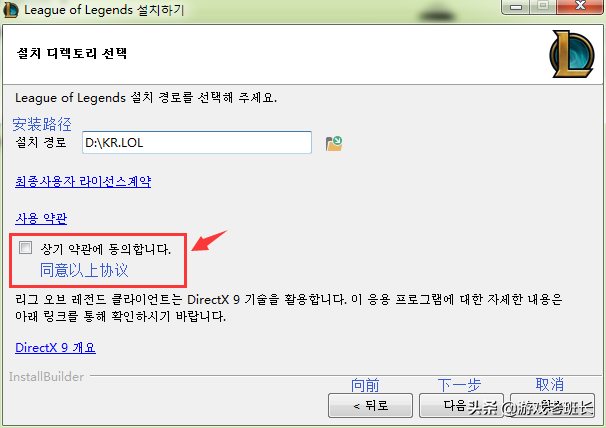1.进入如下界面。安装路径自行选择(用英文名文件夹,可以直接放在上面的KR.LOL里面)。红框上方是许可协议,所以红框要打勾。点击下一步。