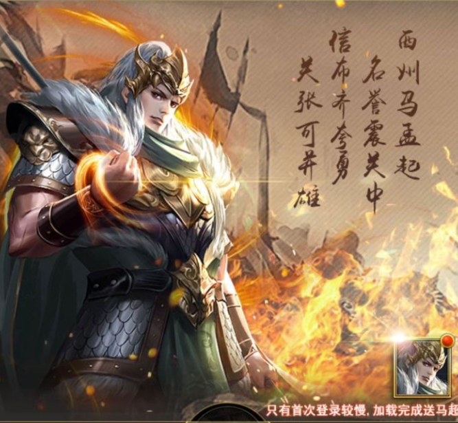 第一次登录就可以发大名鼎鼎的马超。马超的实力还是很强的。后期骑兵飞起来快得可以打到对面怀疑人生。实力推荐~