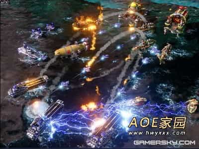 海战一锅粥,注意右上苏联船厂旁的独眼小球,可能是修理无人机。烤焦的飞艇似乎很美味。两条航母之间好像出现了连锁闪电效果?