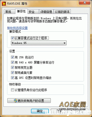 在Win7系统中,各种与老红警的不兼容,如Ra95游戏速度过快,鼠标根本无法指挥部队等,可用兼容性的调整来解决,如下图: