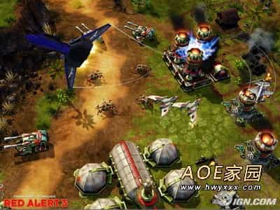 最惹眼的就是地图中央的盟军战机——之前在艺术图中被称为“精确的”轰炸机,可能拥有类似C&C3中火鹰那样的大气层跳跃能力。被它蹂躏的正是苏军的高级反应堆,在反应堆右侧象是吃撑了的Orca的应该是阿波罗战机。此外,就是换了身马甲的新天启了,本图只有她性感的侧影和大屁股,还有脑袋后面的两个闪着蓝光的大罐,不过好消息是4履带回来了(其实应该是4条半,别忘了车头那个碾人专用的“履带”),坏消息是炮管刚出狼窝又入虎口——EALA做一个比较正常的炮管有这么难吗?最后,大家可以通过两架米格的拉烟来想象一下飞机的转向半径,地上有架米格残骸,被IGN的LOGO遮盖处是一个人造卫星——苏联扩展车。