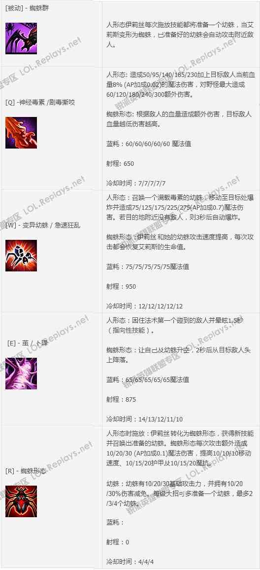 伊莉丝是一位可怕的GANKER,GANK的技能衔接:人类形态Q+W(W为主要输出技能),目标逃跑时用E留住,之后切换为蜘蛛形态开W,再自动攻击。这套连招配合队友造成击杀绰绰有余。