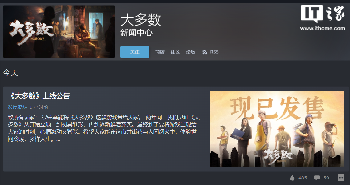 AOE家园 11 月 17 日消息,由有光游戏开发、热脉游戏发行的国产模拟经营游戏《大多数》今日在 Steam 平台发售,定价 68 元,首周 9 折优惠价 61.2 元。