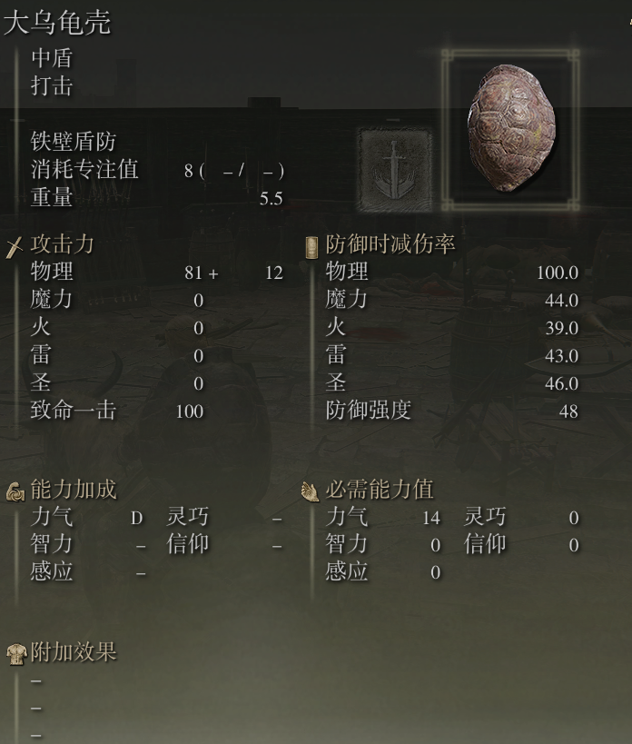 百分百物防,各项防御都比流浪骑士初始给的盾牌属性值要高,是很不错的物防盾。