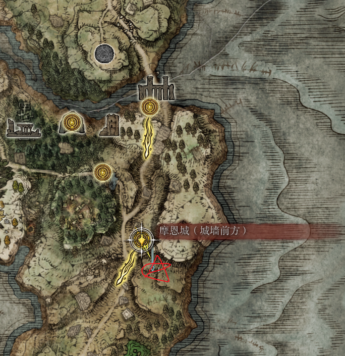 玩家需要从亚基尔湖北方赐福向下移动,沿着道路前进,然后到达下方半岛的摩恩城(城墙前方)篝火。