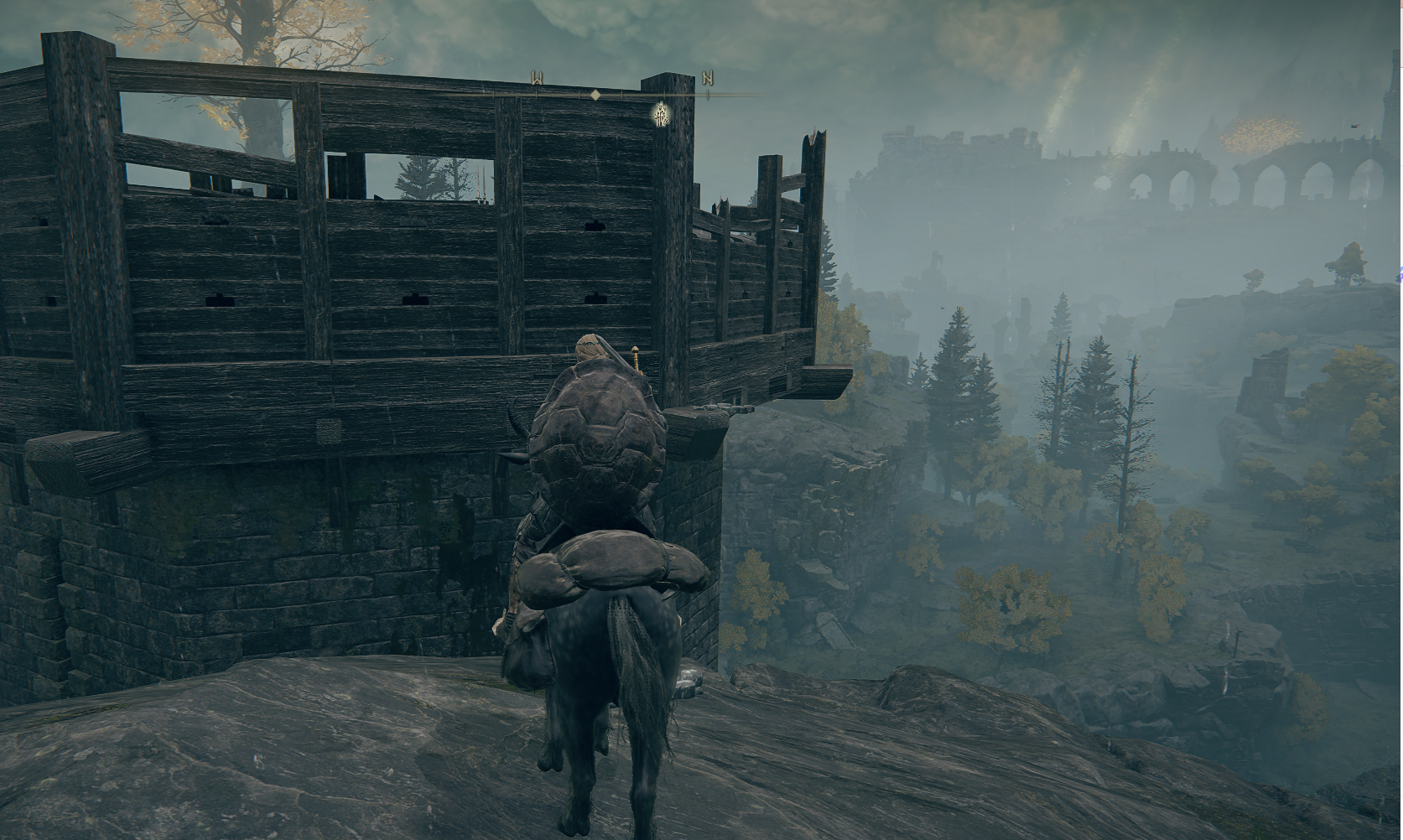 跳上来之后可以发现一座堡垒,可以骑马二段跳踩边缘横木进入。