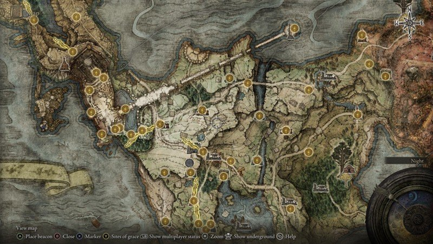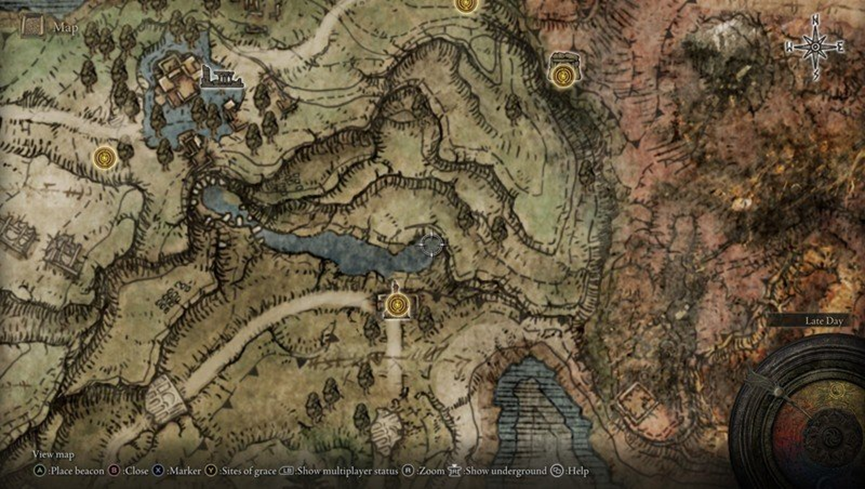 首先,前往水源的东边角落,就在Limgrave的第三教堂以北。在那里,你会发现一个小型的紫色传送门,互动一下,它会将你传送到Dragonbarrow(传送门的位置在上图中显示)。