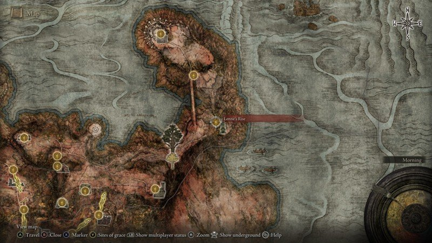 通过传送门,你会安全地到达Dragonbarrow,就在在入口处的一个小怪后面。你需要跑过这个小怪,然后继续向左跑,向南经过一座小桥到达一个塔。在附近找到Lenne's Rise Site of Grace(赐福点),在那里休息,以重置所有在追赶你的敌人。休息后,向西边寻找通往拱门下的道路。骑上你的坐骑,开始沿着这条路前进。