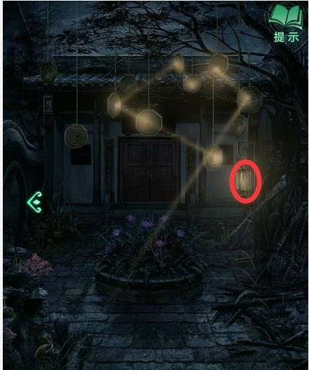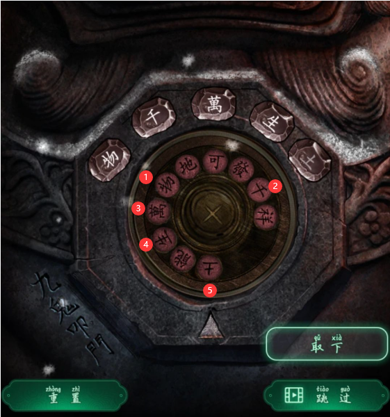 回到大门口,将【拨号盘外壳】安装在石狮子上,对照窗户上得到的线索,转动圆盘将对应的字依次到达下面三角位置(窗户上花瓣的数量就是顺序),获得【钥匙】,取下【拨号盘外壳】。