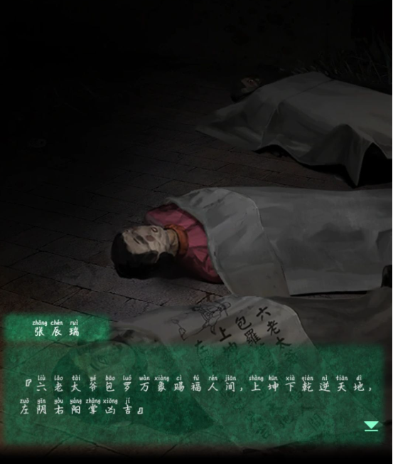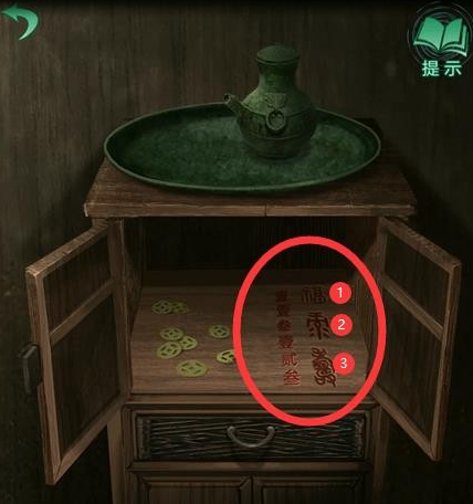 记住柜子中的信息,来到左边院子正前方的屋子内,根据规则中的信息依次敲击对应的棺材(1-福、2-禄、3-寿,113123-福福寿福禄寿)。