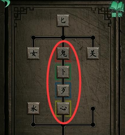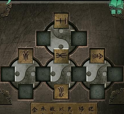 查看右边的柜子,对照下面的五行相克原理(木→土→水→火→金→木),将金色方块调整到被克制的底座上方,如图打开柜子获得【铃铛】。