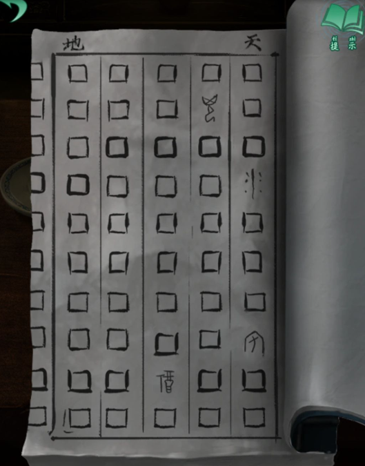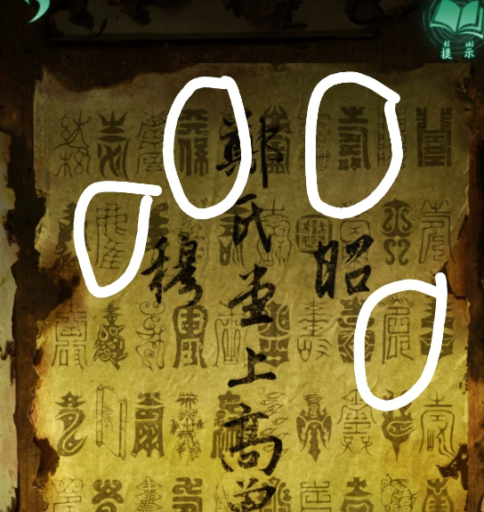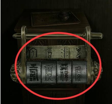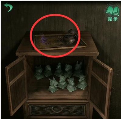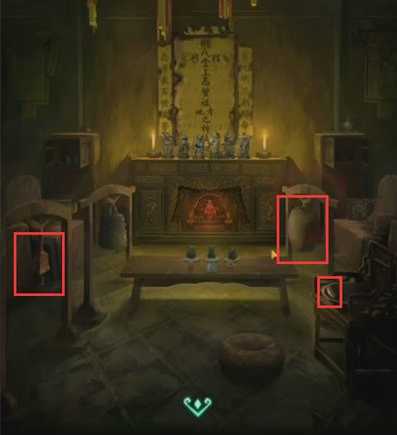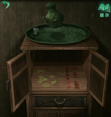 查看桌子上的书,对照墙上的百寿图,找到书中特殊符号所对应的寿字(书上的线索需要向左倾斜90度,根据书上一堆空格里符号位置,去数符号对应百寿图的位置找到对应寿字),查看左边的柜子,对照特殊符号上的数字,调整锁中的图案,打开柜子获得【羊头雕像】和【猪头雕像】。
