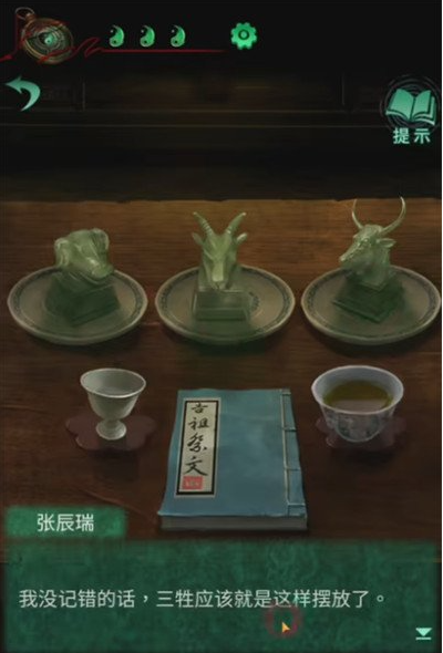 查看中间的桌子,如图根据书上的记载将【一杯酒】【一杯茶】三个生肖雕像分别放在对应的位置(男-阳,女-阴,男左女右,阳-左,阴-右)