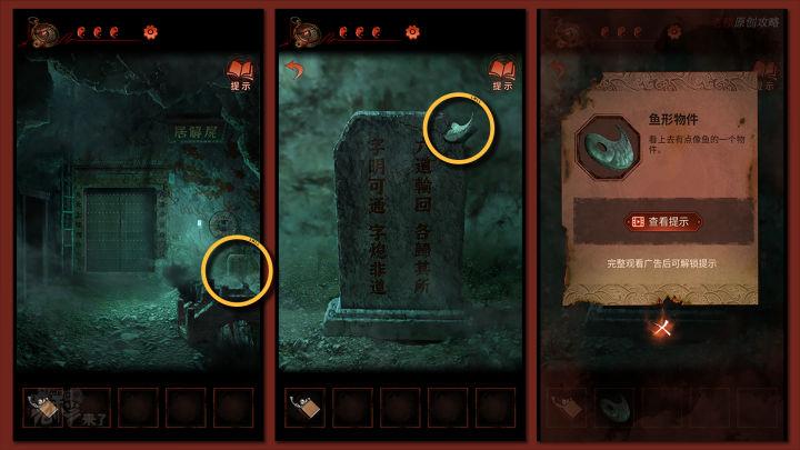 【女主视角】:观察【尸解居】右侧墓碑,拾取【鱼形物件】
