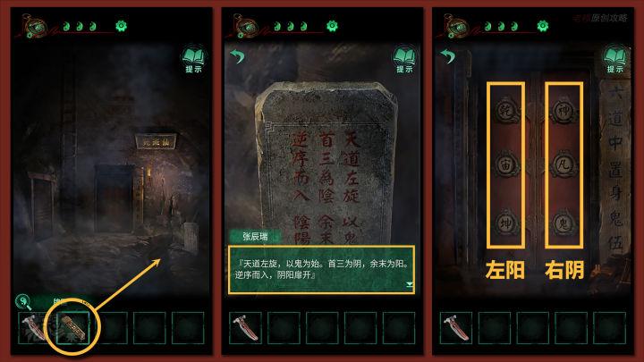 石碑写道:逆序而入,阴阳扉开,首先根据左为阳、右为阴(例如我们常说的男左女右),将门分成左门和右门,从下到上逆序排列,所以左边门密码由上至下是【乾宙坤】,右边门密码由上至下是【神凡鬼】