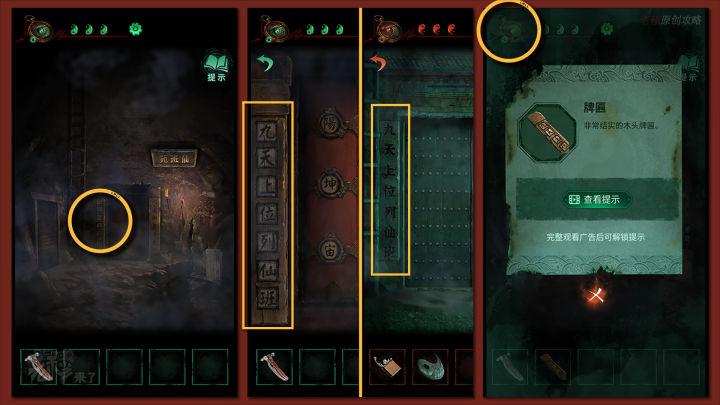 【男主视角】:点击左侧的牌匾,按照女主视角看到的文字重新排列:【九天上位列仙班】,拼出后拾取【牌匾】