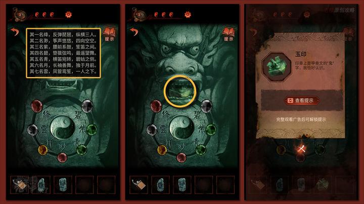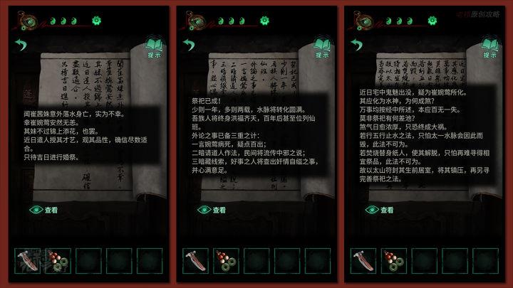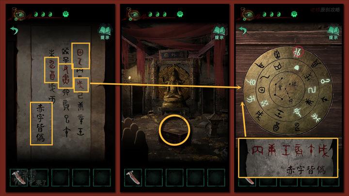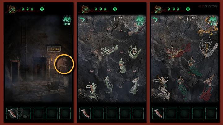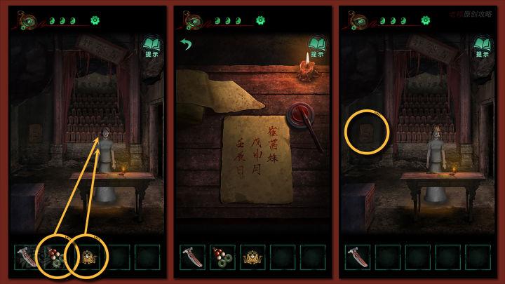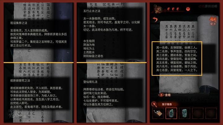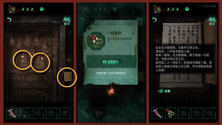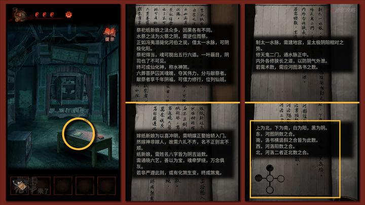 【男主视角】:先切换到女主视角,来到【机巧阁】,点击【龙形石碑】的八卦开关,打开【机巧阁】左侧的石门,这也就意味着打开了男主视角【身外廊】左侧的石门,再切换到男主视角,进入【百祭轩】,给纸新娘带上【一对耳环】和【凤冠】,并在桌上的黄纸上协商生辰八字,观察左侧墙壁上的图案
