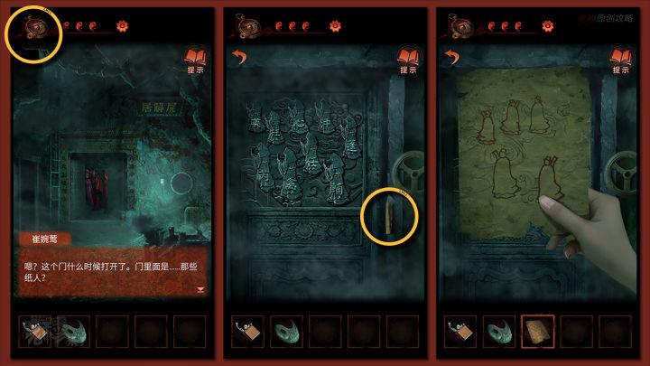 【女主视角】:切换视角自动触发剧情,牌匾后的房间自动打开,观察右侧石缝中的线索纸张