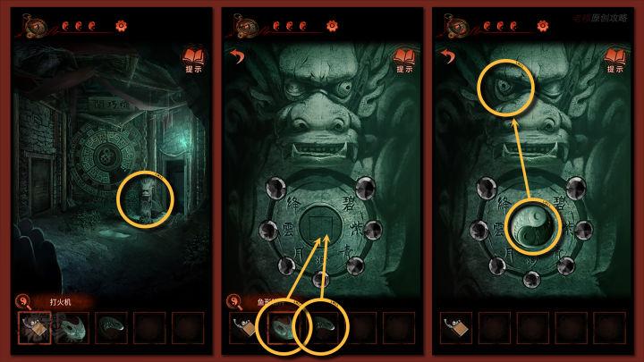 【女主视角】:来到【机巧阁】,观察【龙石碑】,将得到的【鱼形物件】安装在中部的圆圈中,通过点击八卦(黑白鱼)可以开关【机巧阁】左右两侧的石门,但每次只能开其中一扇门(龙的眼睛会睁一只闭一只,睁着代表开),让左侧门打开