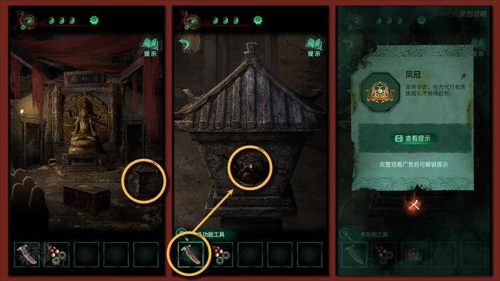 【男主视角】:切换到男主视角,男主进入左边的房间【身外廊】,观察右侧的石灯,用【多功能工具】砸开石头,拾取【凤冠】