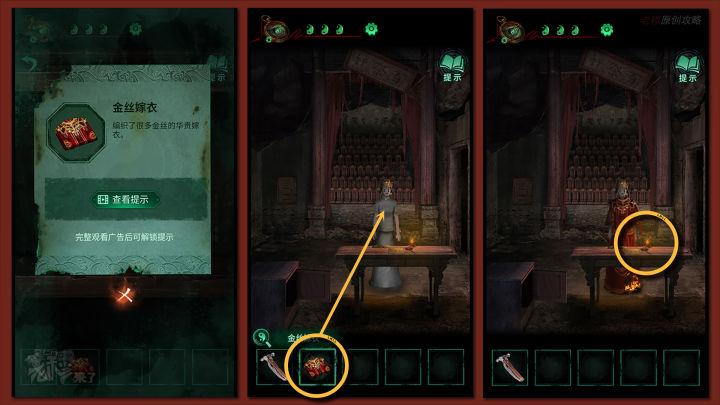【男主视角】:机关打开后,得到【金丝嫁衣】,并回到【百祭轩】,给纸新娘穿上【金丝嫁衣】,这时点击桌面,点击烛台,会触发剧情