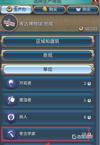 5,在生产菜单中选择单位“考古学家”,等待一定的回合数。