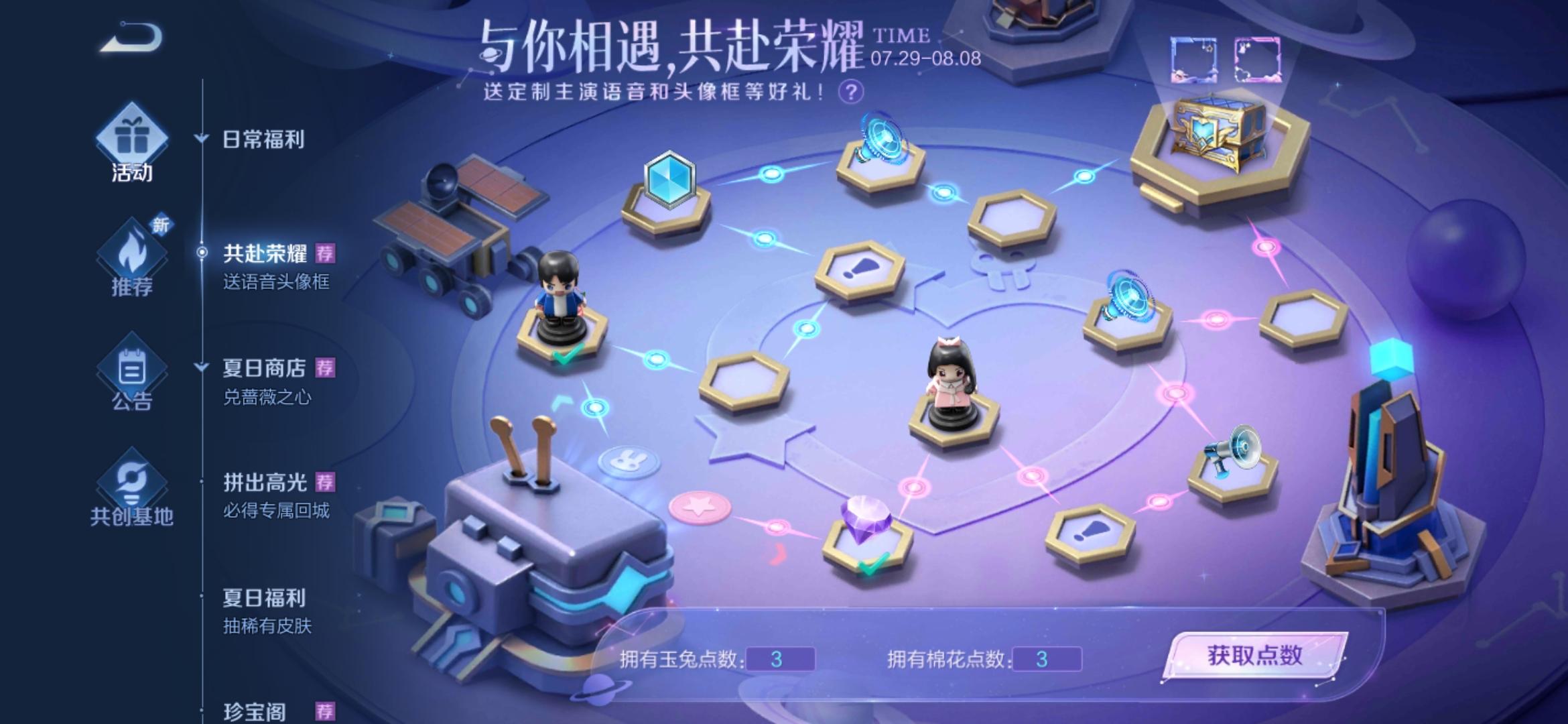 这个活动叫共赴荣耀,活动时间是7月29日~8月8日,总共是11天,活动中有铭文碎片、钻石、喇叭、头像框等稀有奖励;大家进行这个活动需要操控玉兔棋子和棉花棋子向终点前进,前进时大家要有点数才能移动,移动一次需要4个点数,获得点数需要完成活动任务。获取之后大家就能前进了,前进到对应的格子里能够领取到不同的奖励,也会遇到一些彩蛋问题,请注意问题要回答正确,这样你就能领到更加丰富的奖励,而关于这些问题的答案我会在下面内容中告诉大家。