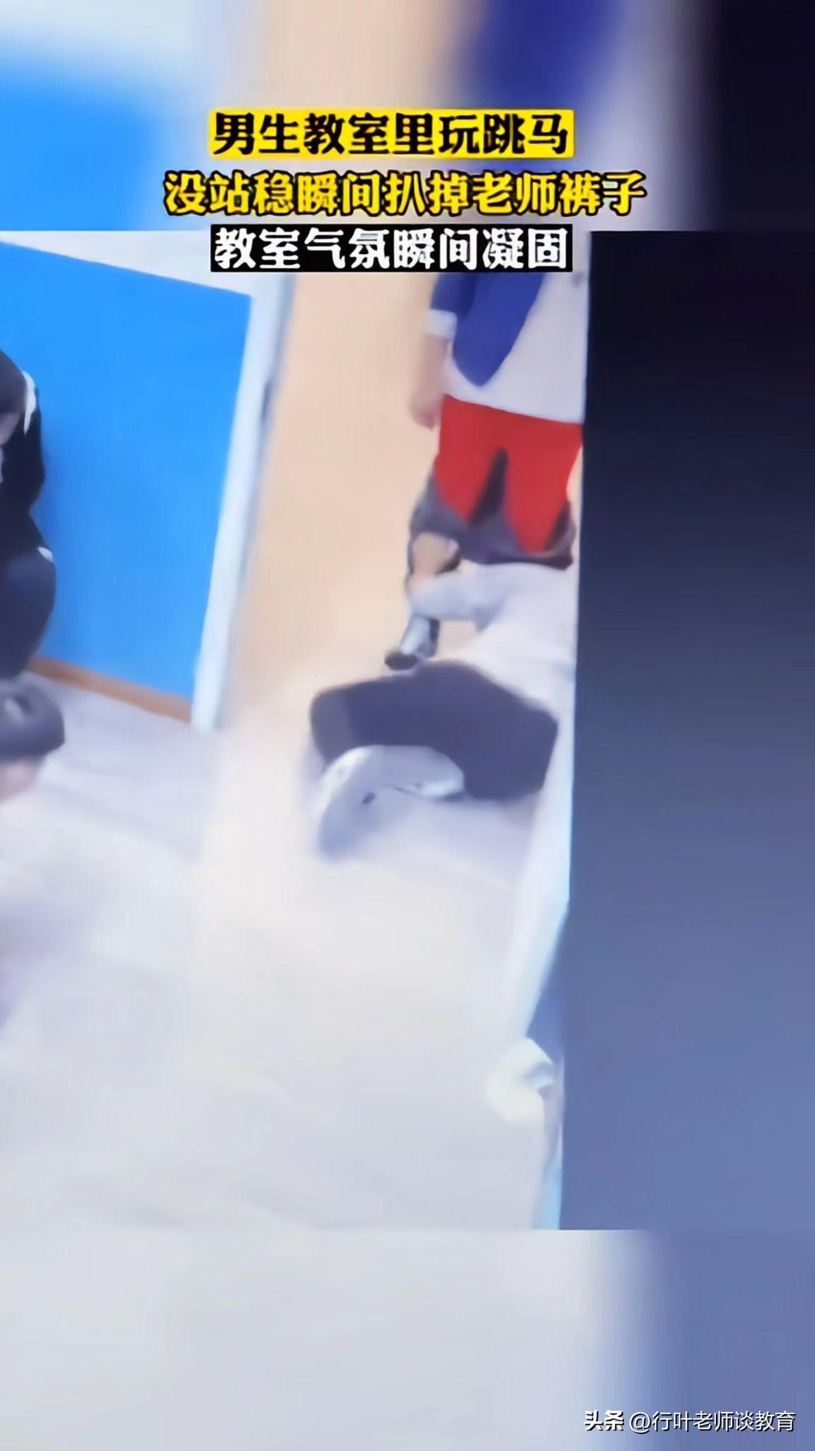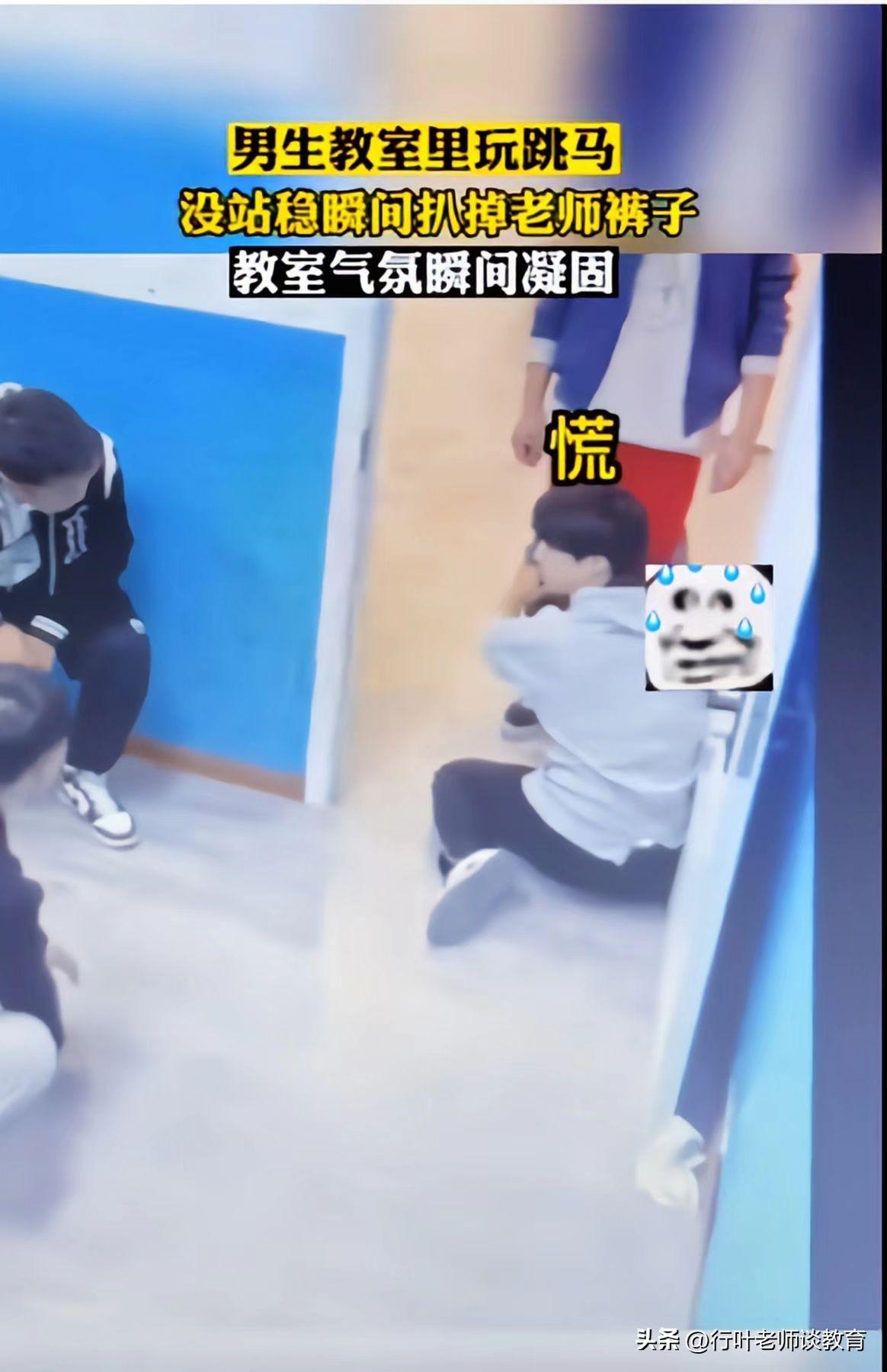 而当这位同学抬头看的时候,才发现自己把老师的裤子扒了下来。突如其来的变故,让这位同学呆愣在原地。