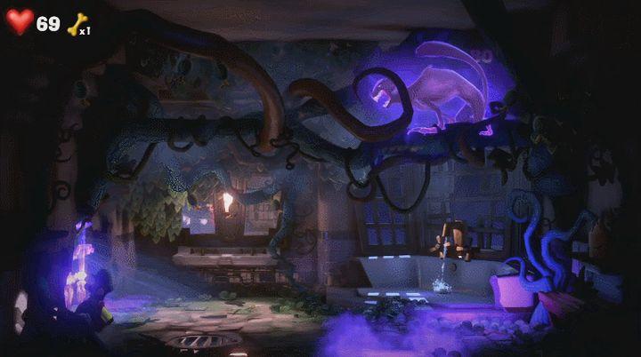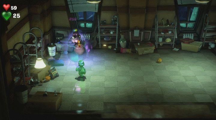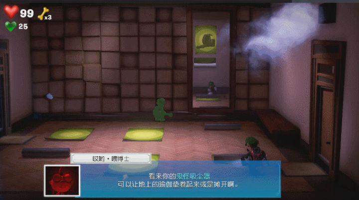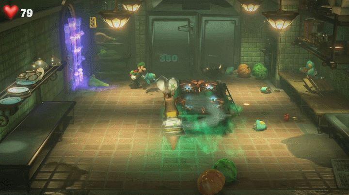 第二层关卡也没有复杂的地方,boss战开始前,先和傀路易吉一起用吸尘器将场地的烟雾清扫干净。之后的厨师boss,需要借用场地的一些投掷物,先击中厨师boss让它产生硬直,之后就可以照射+吸取了。