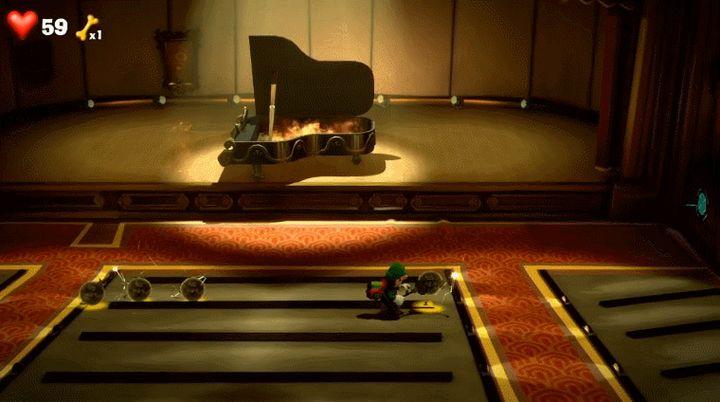 第四层开始的钢琴boss难度略有提升。主要打法见gif图,在boss扔出炸弹时,利用吸尘器,将炸弹反扔进钢琴,然后利用塞子将钢琴拉扯到地上,之后boss会出现真身,再使用照射+吸取即可。