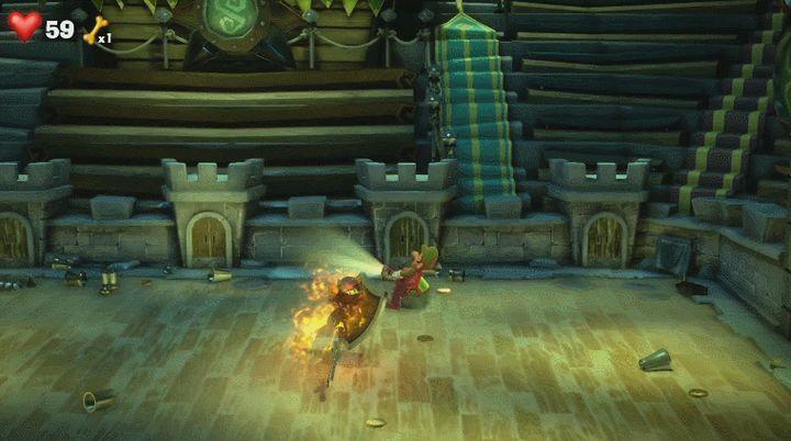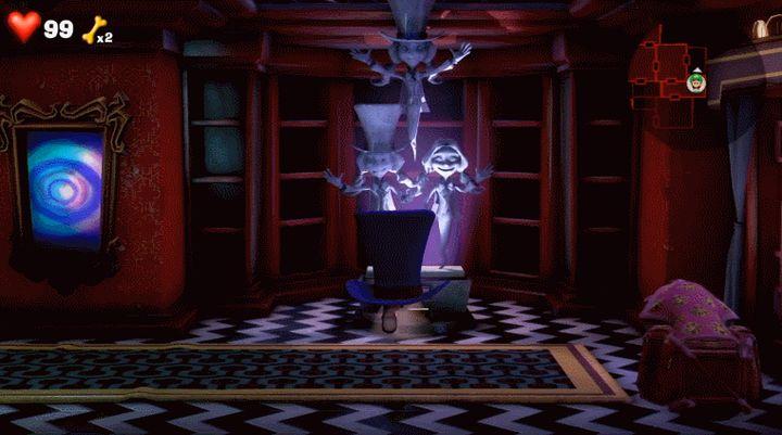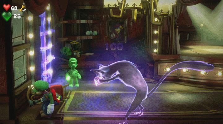它lei了,又来躲猫猫了 – -!带着路易吉绕了好几层后,然后再魔术师的楼层绕来绕去,猫妖终于要跟你决战了。最后的战斗不太一样,猫妖记住了你的攻击,打法依旧是先勾引猫妖偷袭你的背后,但是此时如果你突然转回来照射它,会遭到它的闪避,然后进行二次攻击将你击倒。所以这里做法要改变一下就是。。。让傀路易吉来攻击它,它会无视傀路易吉,所以一次就成功了。。。下面的gif图展示的应该比较清楚。