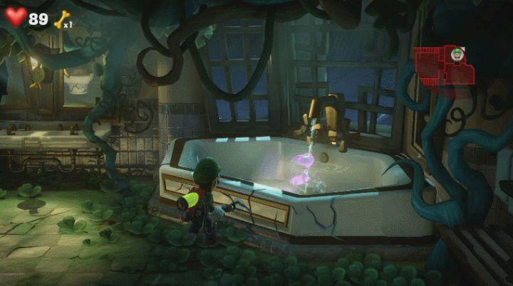 从摄影棚的关卡出来后,电梯的楼层按钮会被猫妖抢走,这时会产生一段追逐猫妖的探索,利用探照灯照射地面的猫妖痕迹,最后可以找到猫妖。下面这个gif是一个比较容易卡关的地方(至少我就卡关了。。),猫妖躲在浴池里瑟瑟发抖死不出来,你需要使用吸尘器将水龙头吹开,水充满浴缸后,猫妖就跑出来了。