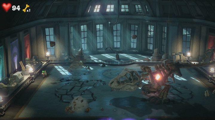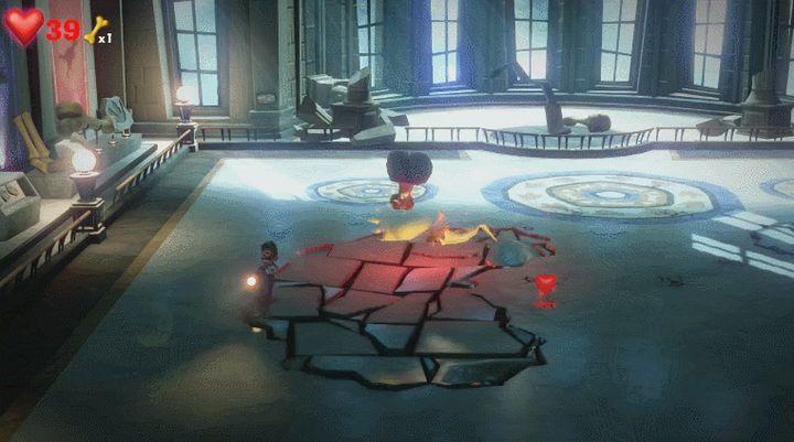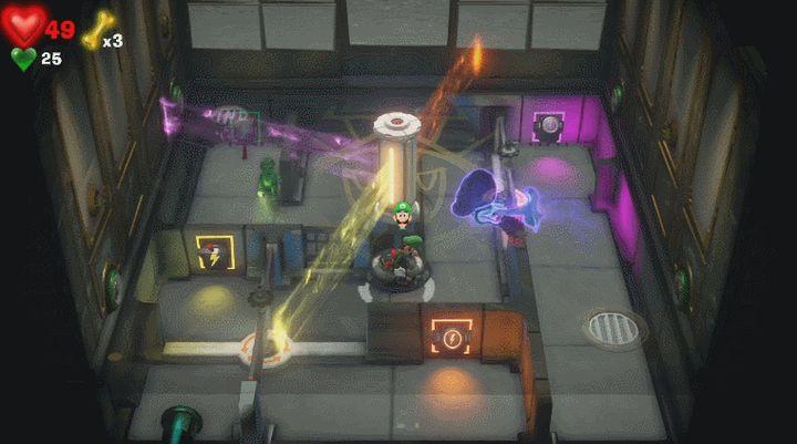 对boss造成伤害本身是比较容易的,在boss抬手蓄力一击挥空后会有一个硬直,此时使用吸取+照射即可。难的部分是场地的先知,由于有移动激光障碍限制了你的移动,所以需要切换傀路易吉去地下将激光一一关闭,借此来恢复你的位移能力,为之后吸取boss展开空间,需要一丁点双操的意识在里面。