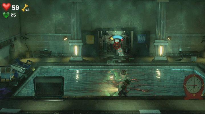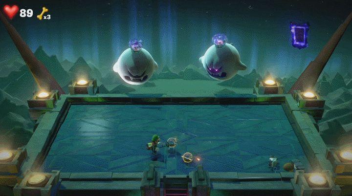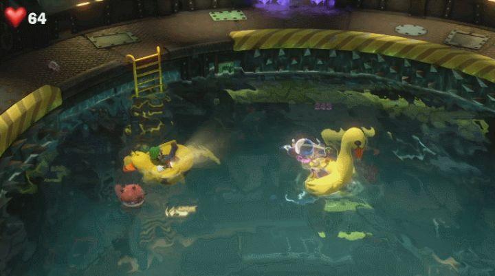 boss站比较蛋疼啊,因为打法十分明显,但是就是试了很多次才成功。。。通过让本体吸引boss,让傀路易吉趁机逃到阀门处的柜子后面,之后同样是用本体吸引boss,让路易吉打开阀门,这就成功一大半了。最后boss会被塞子吸住,此时利用场景的排球砸晕boss,就可以照射+吸取了。