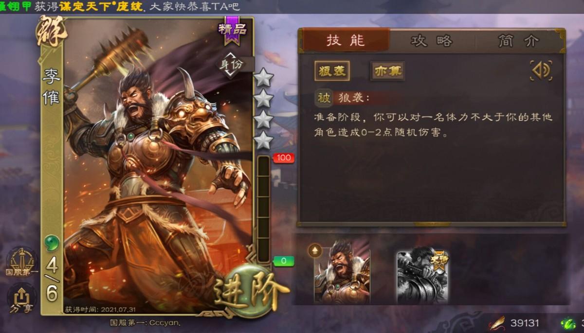 论适用性,排位、军争、斗地主,都能适用。斗地主不但可以当农民,没武将的时候,当地主也不是很差。可以说除了国战,每个场合都能拿出来溜溜。算是一个万金油武将。