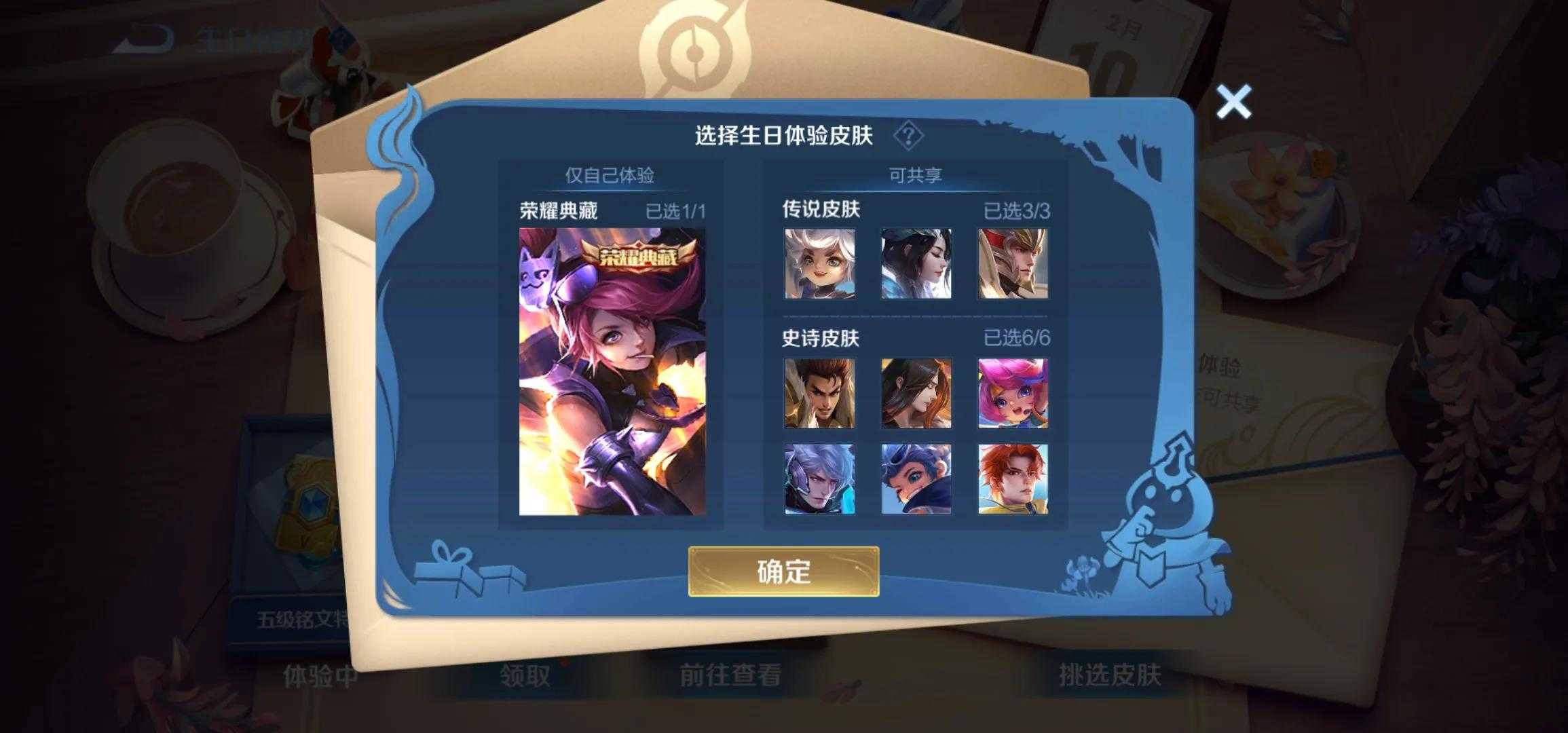 所有荣耀典藏的皮肤可以任意选择一款作为体验(注:不包括英雄武则天,所以如果没有武则天的话,我就建议不选择武则天的皮肤)