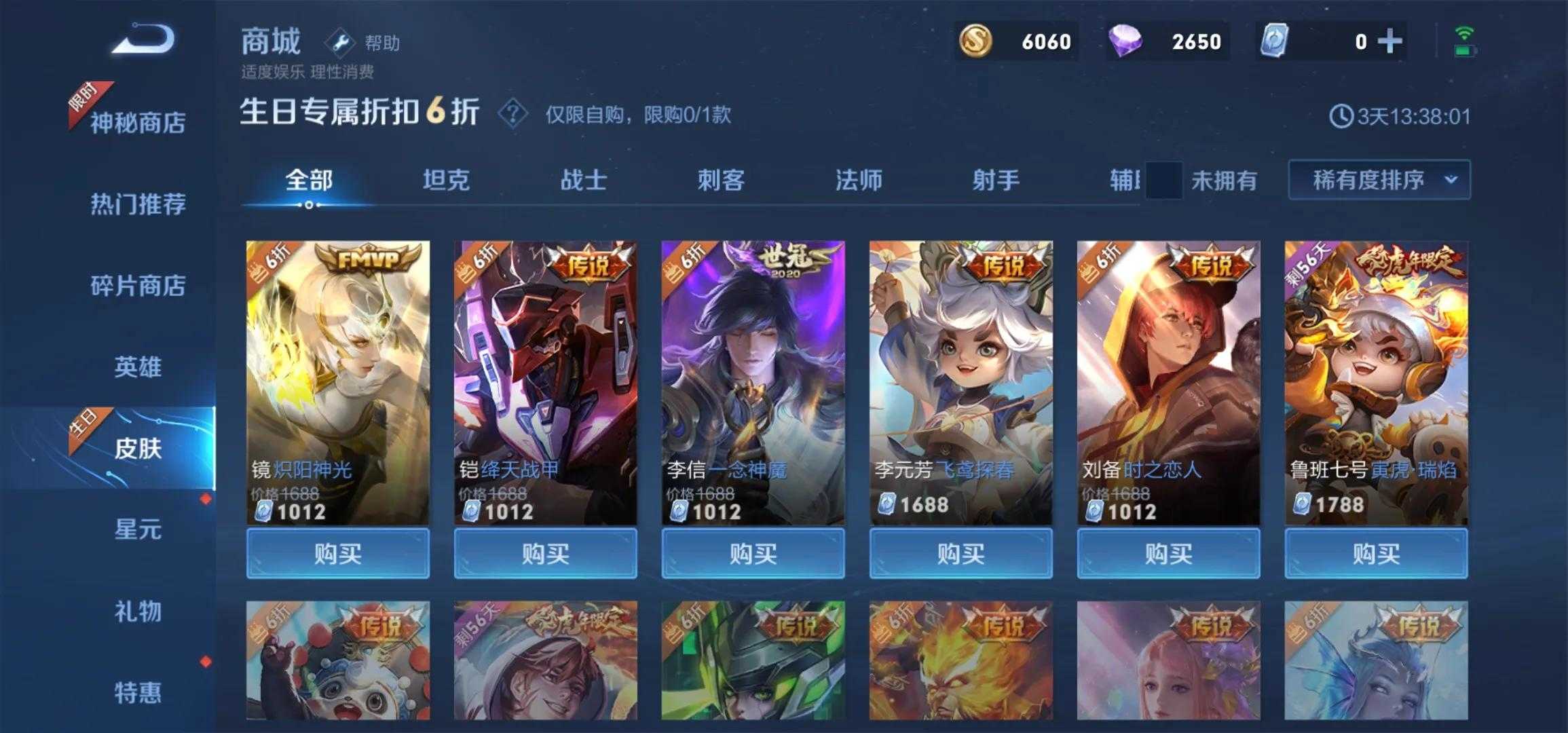 在生日期间会有生日专属折扣价特权,在商店中购买一款皮肤仅需6折(生日期间只能购买一款皮肤),大部分皮肤都能买,除了近期上架的和限定,都是六折,不过只能买一个(如图所示,李元芳的皮肤——飞鸢探春和鲁班七号的皮肤——寅虎 瑞焰不在六折皮肤特权内)