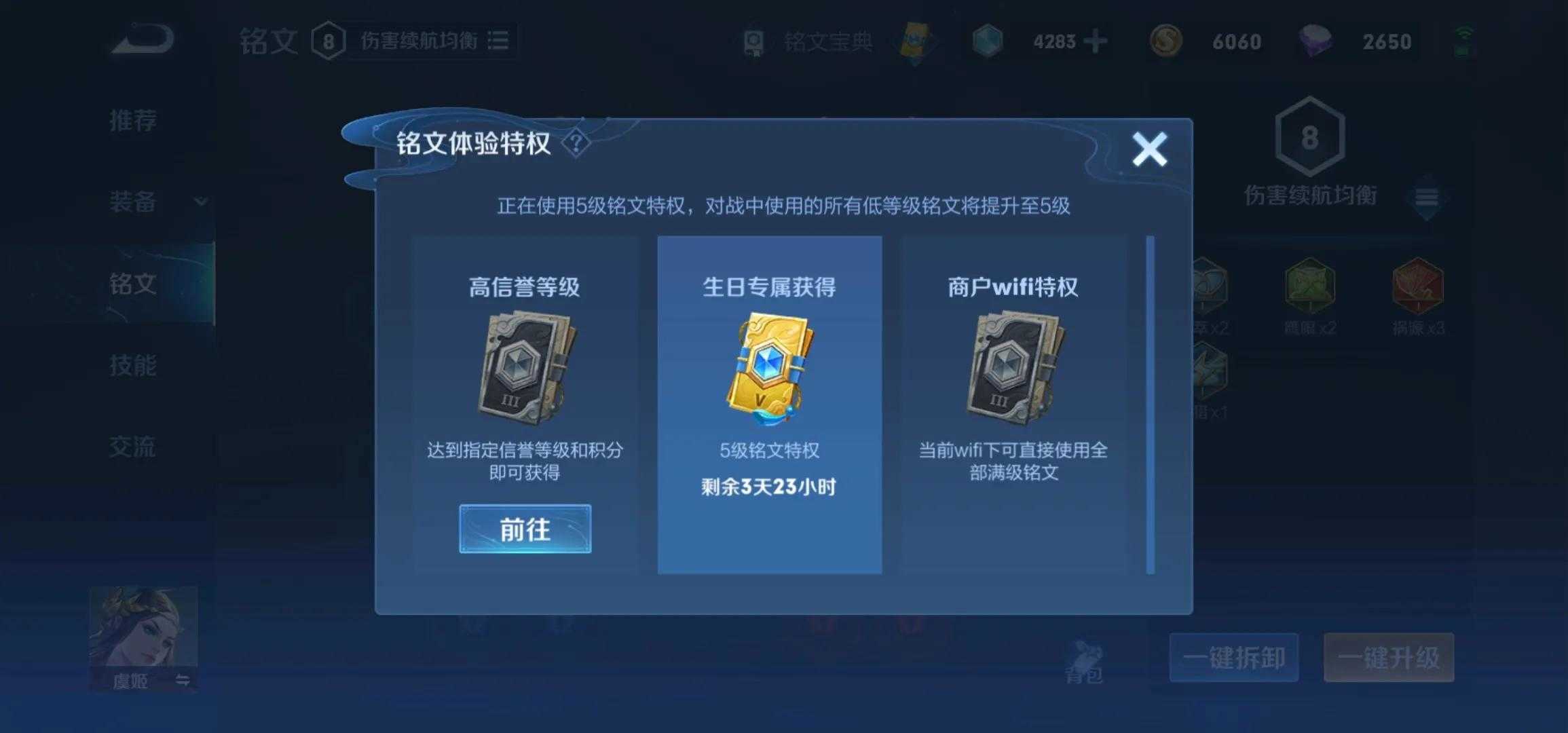 在生日当天可以享受总共四天的五级铭文特权,对于老玩家来说,这一点显得不是很重要。