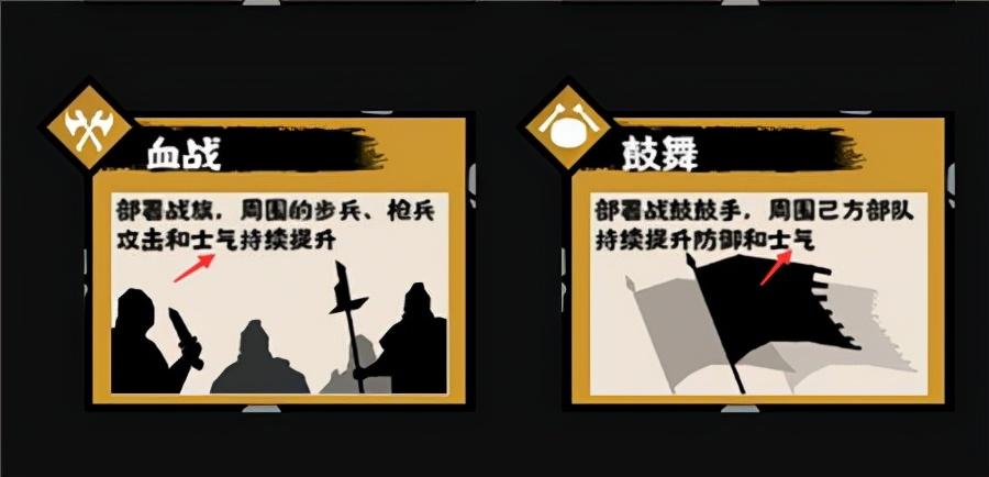 1、作战时妙用部分卡牌(如”血战”和”鼓舞”)可以有效提高士气,给自己加满满的buff,在战斗中轻松制敌,傲视群雄。