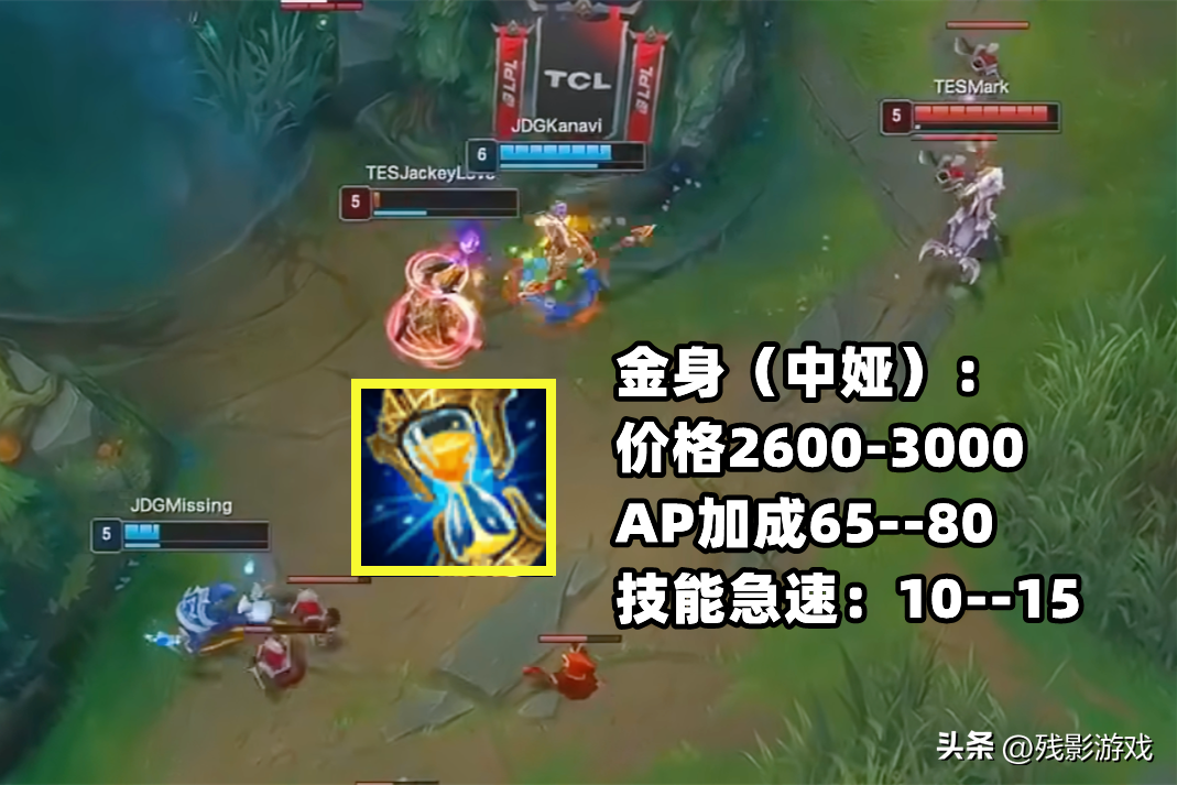 直接涨价400是不是让大家伙都慌了?其实还好,比起秒表的的涨价,金身至少还多给了一些属性值。他的AP加成从65点提升为80点,技能急速从10点增加到15,看起来有点涨价换属性的感觉,但其实大家想想,金身无非就是一个有CD的秒表,在赛场上比起这一点属性值的加持,选手们肯定更需要金身的机制,因此残影觉得金身涨价只会延后选手自保能力的提升,算是削弱。